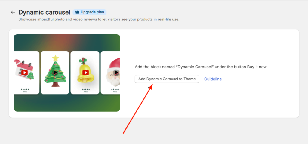 - Click the “Add Dynamic Carousel to Theme” button to be redirected to your store’s Theme Editor.