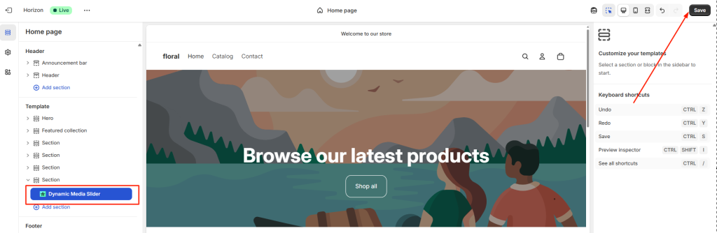 - Add the section named “Dynamic Media Slider”, then click the Save button.